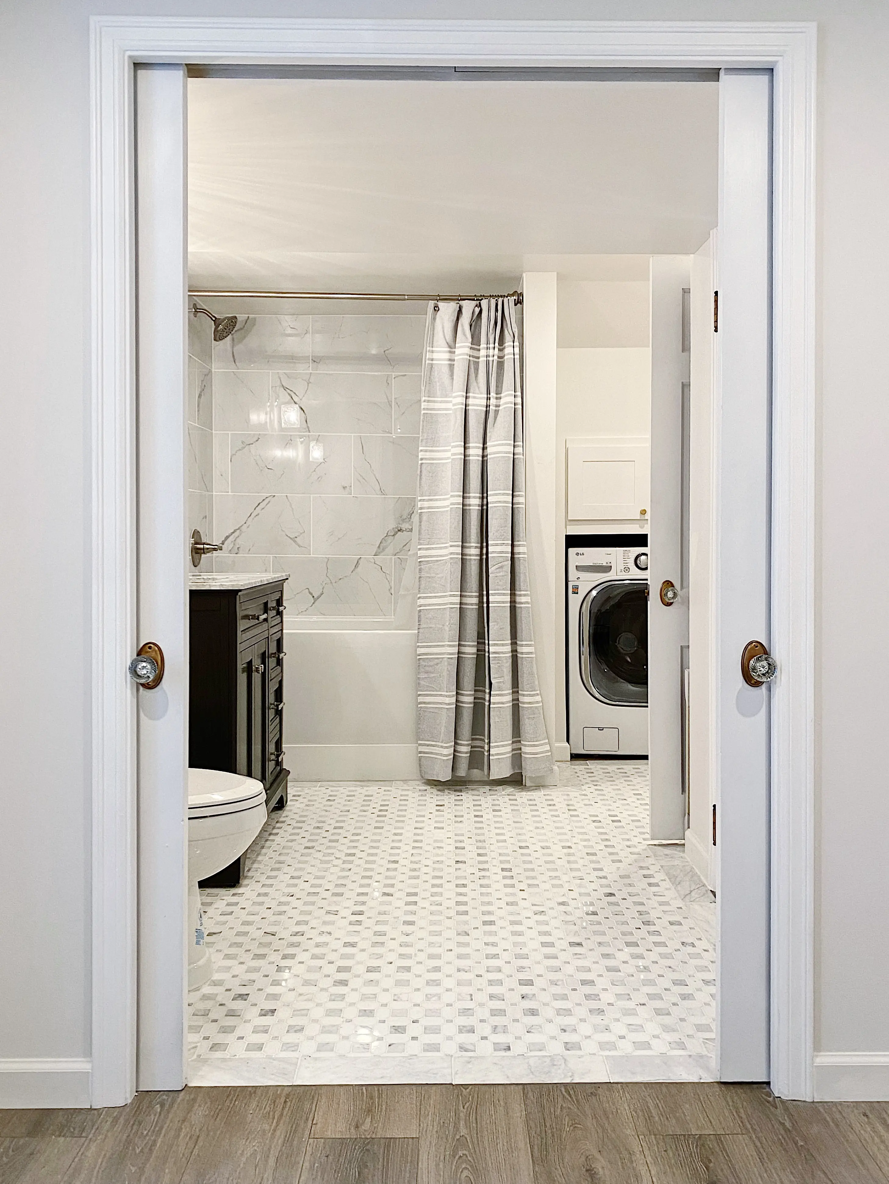 The full bathroom complements the home's modern design with high-end marble tile, a modern soaking tub with shower, and the convenience of in-unit laundry!