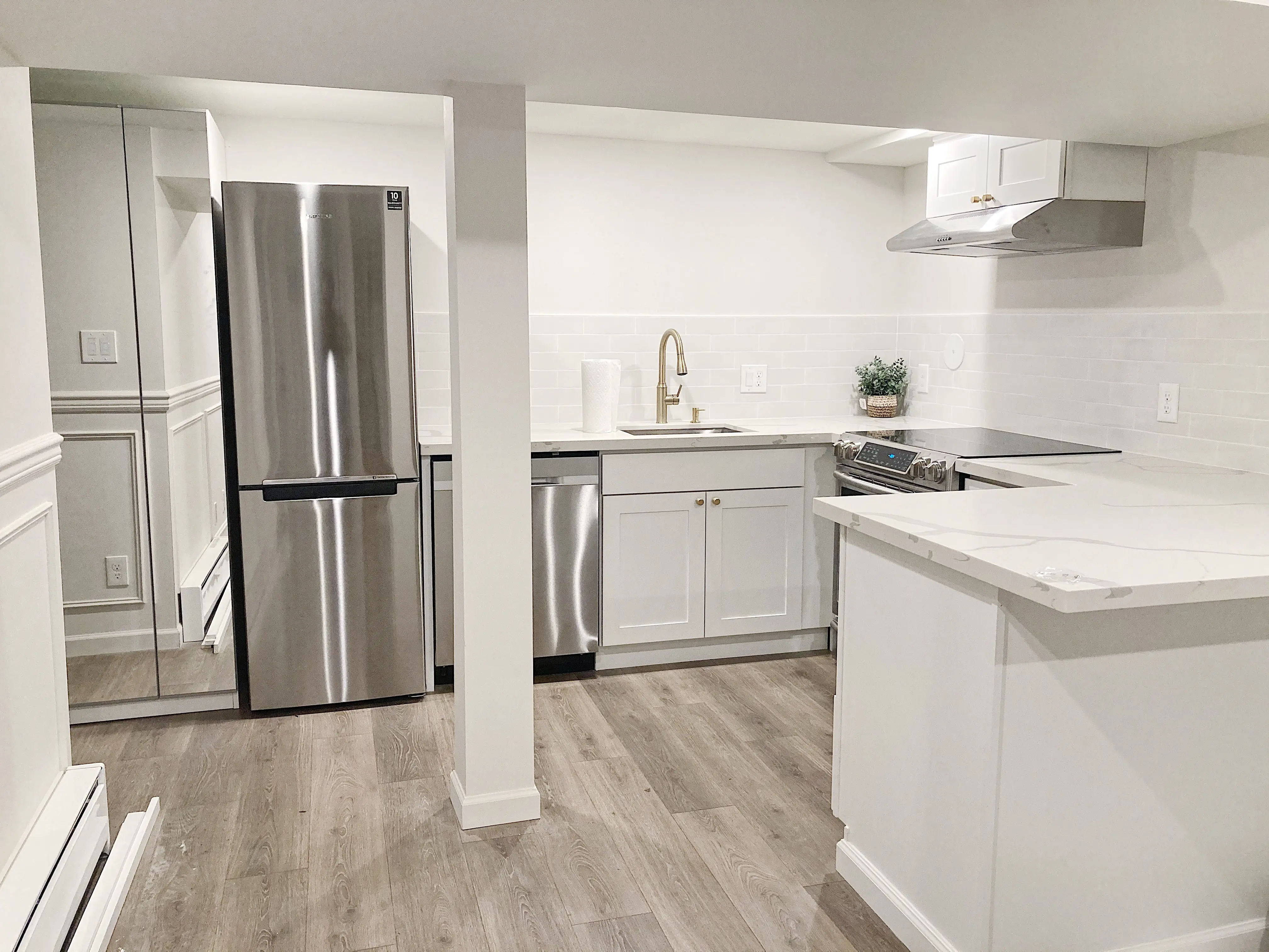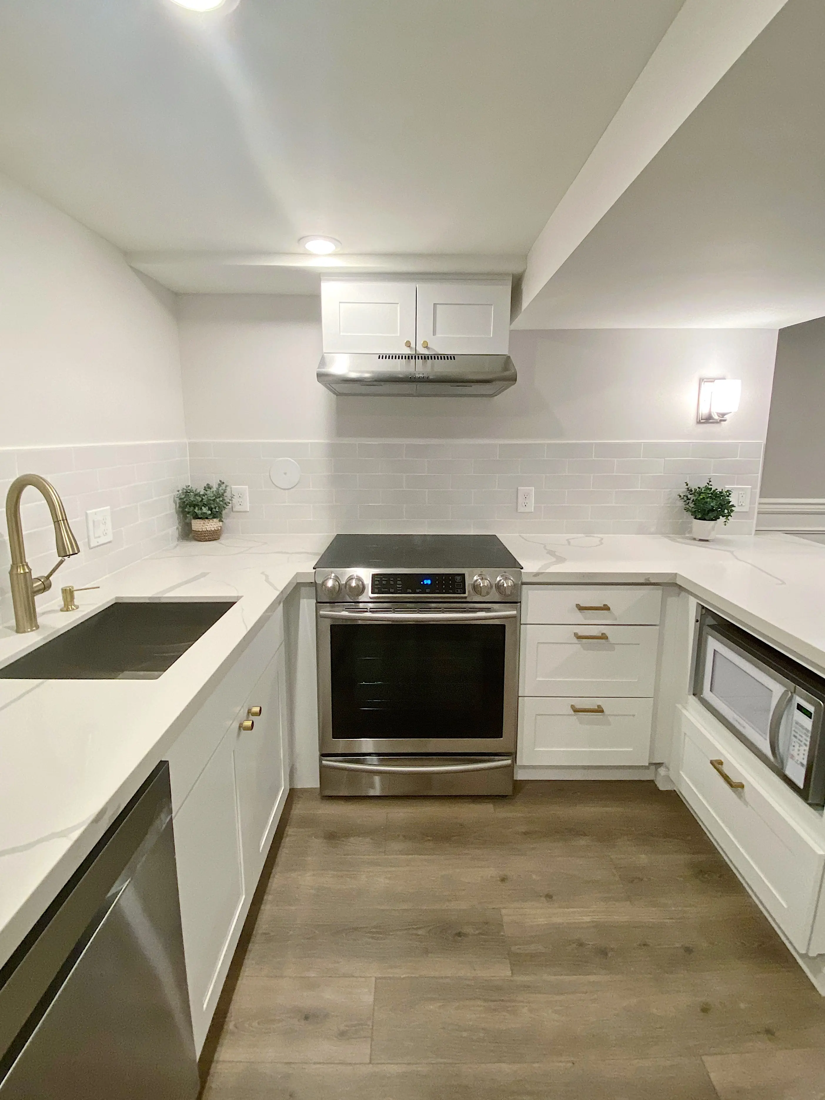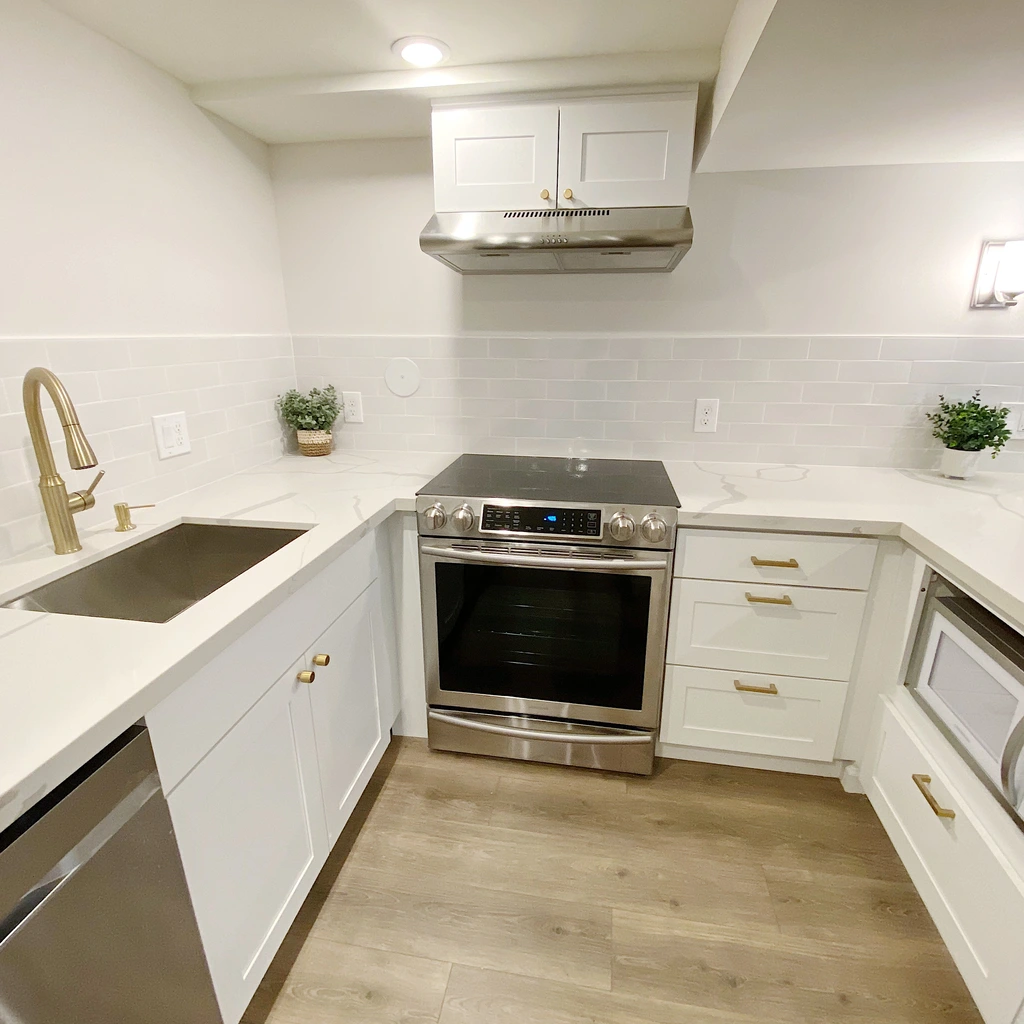 Step inside to a stunning chef's kitchen featuring marble-look quartz countertops, stainless steel appliances, designer brushed-gold fixtures, and beautiful modern tilework. The kitchen includes an induction range, dishwasher, refrigerator, microwave, and vent hood — plus excellent storage throughout.