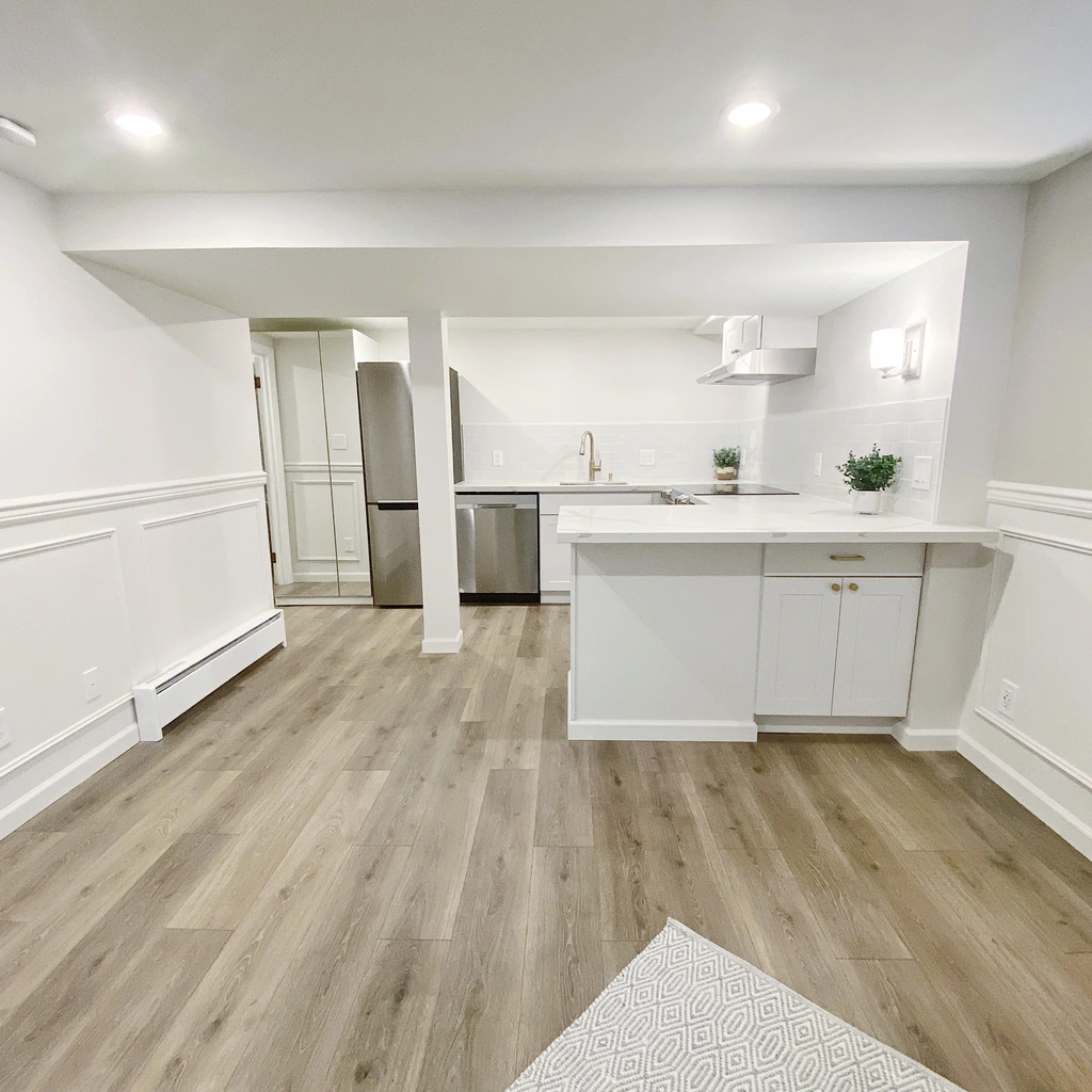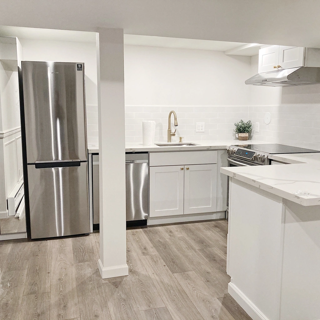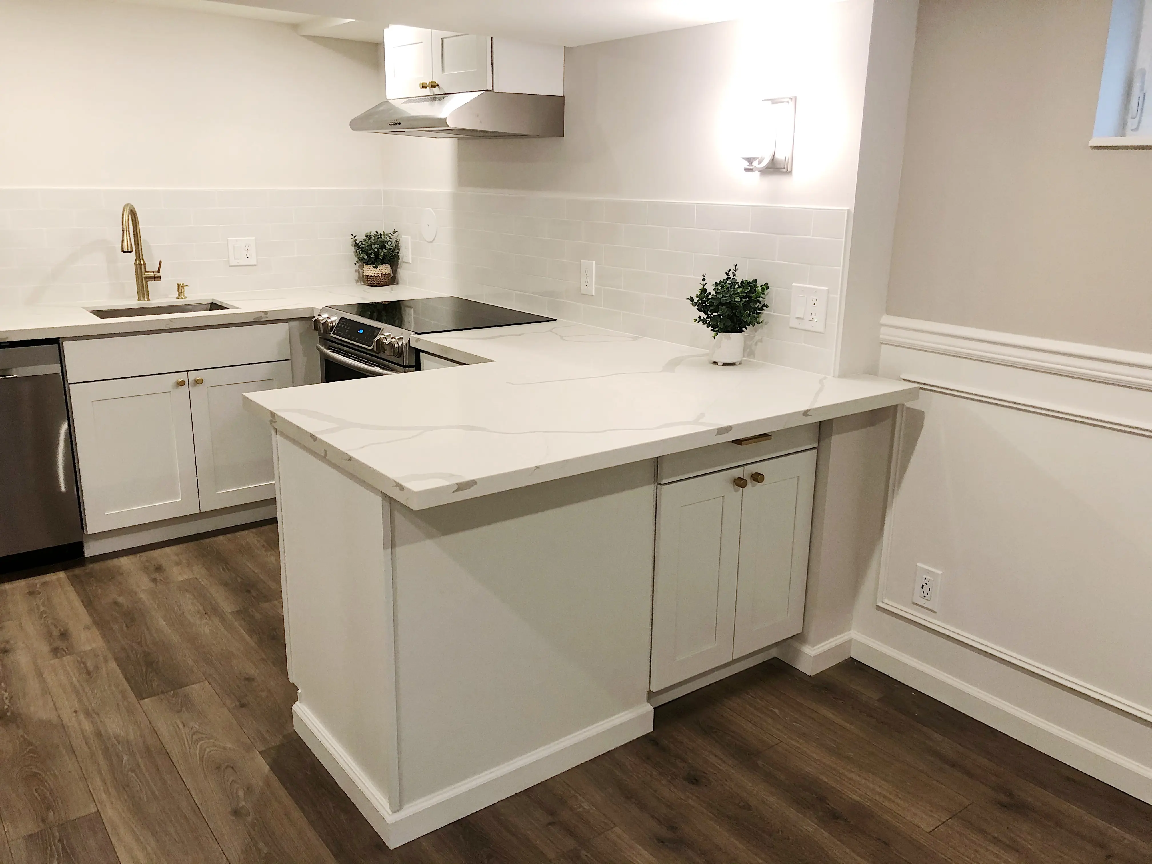 Step inside to a stunning chef's kitchen featuring marble-look quartz countertops, stainless steel appliances, designer brushed-gold fixtures, and beautiful modern tilework. The kitchen includes an induction range, dishwasher, refrigerator, microwave, and vent hood — plus excellent storage throughout.