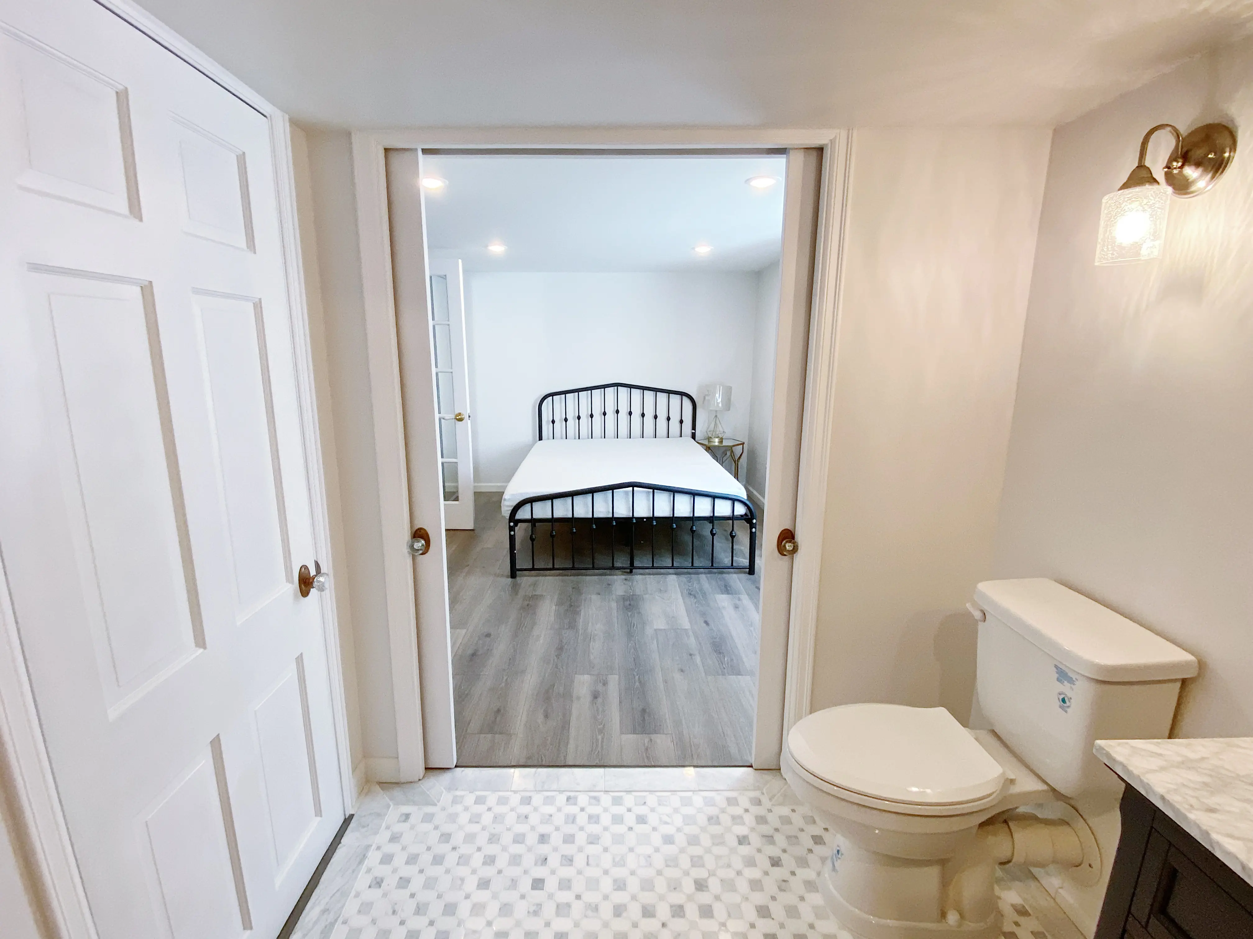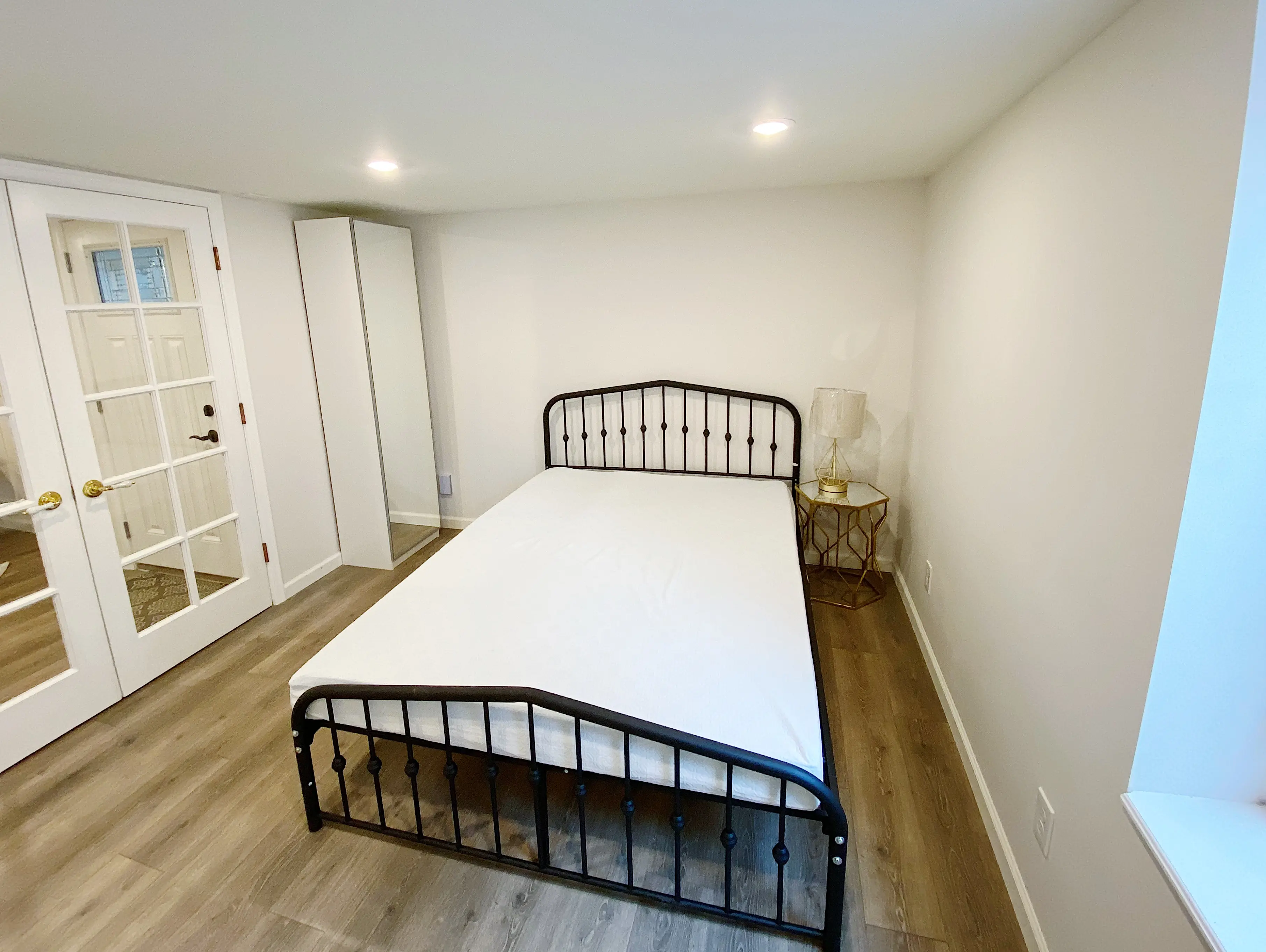 The bedroom offers beautiful flooring, a large window, storage, and elegant French doors that bring in abundant natural light, creating a bright and welcoming retreat.