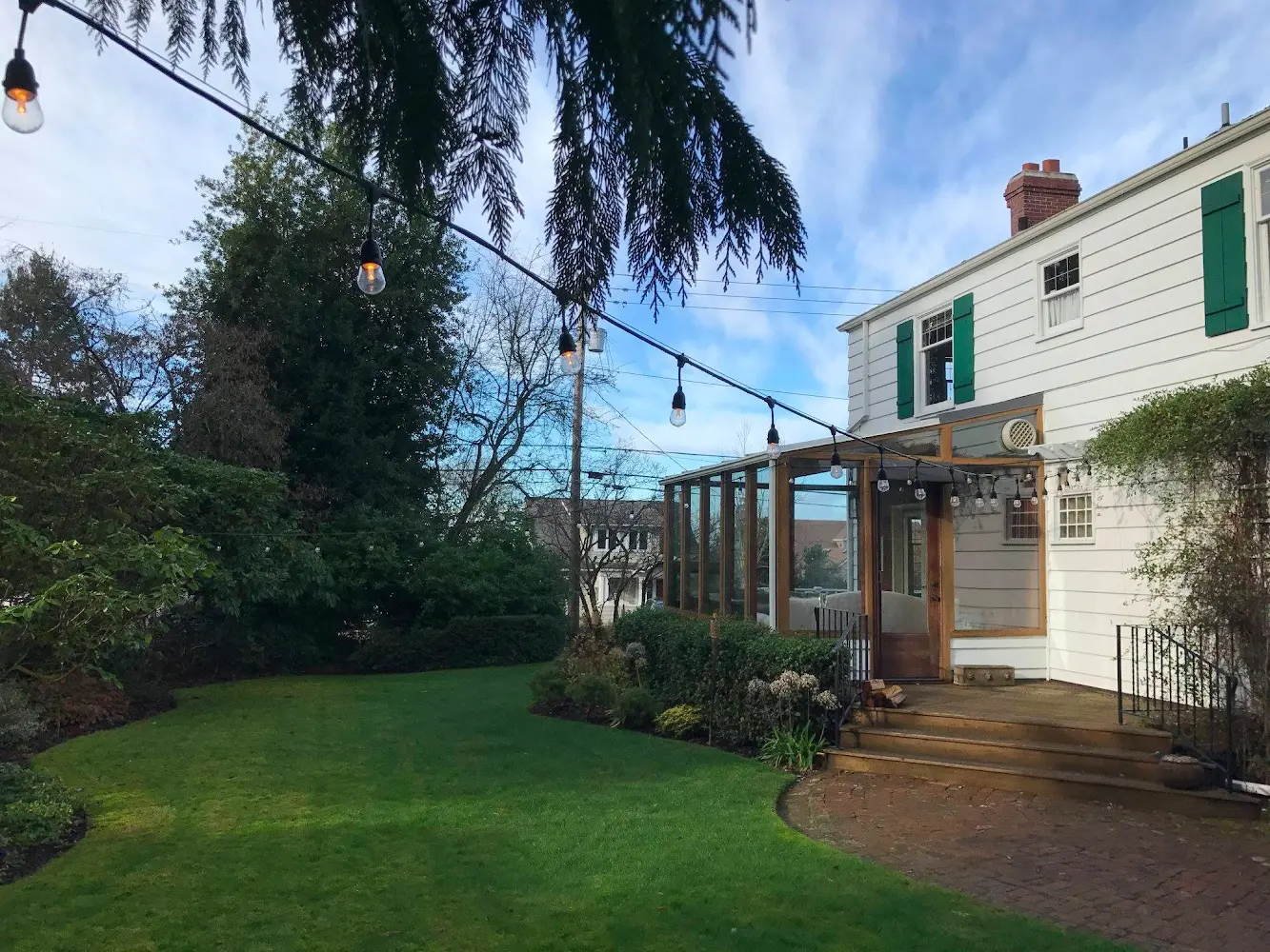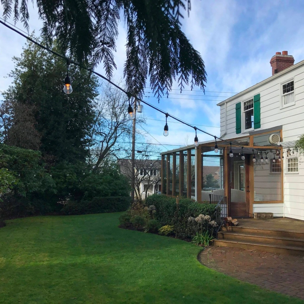Large backyard with lush greenery and twinkle lights.